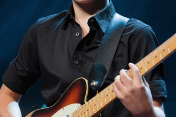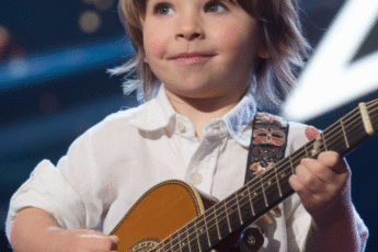 A young boy, dressed sharply and brimming with quiet confidence, steps onto the stage, gripping his guitar