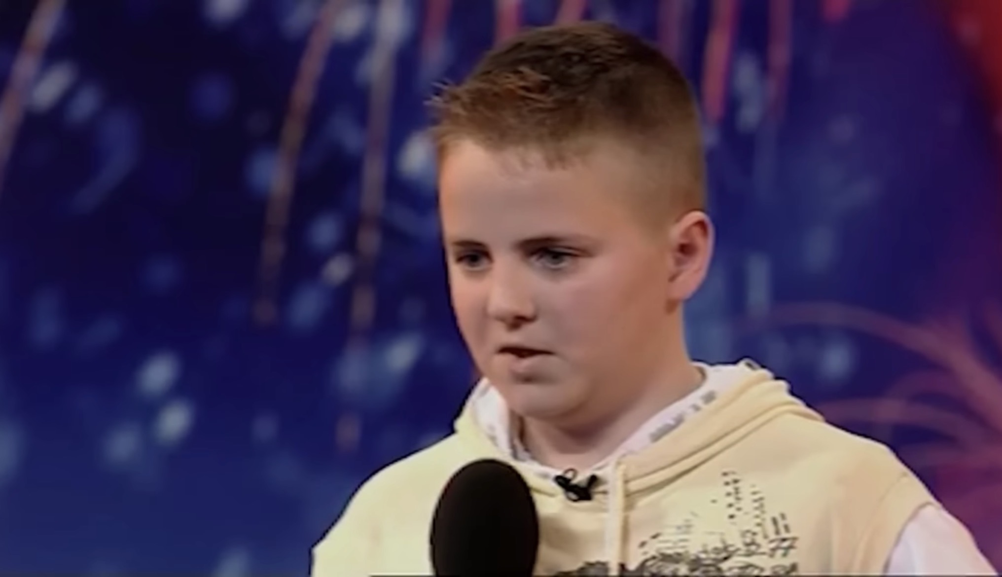 Thirteen-year-old Andrew Johnston walked onto the stage with a quietness that made him almost blend into the background, a skinny teenager in a simple shirt who looked more comfortable at a music stand than under bright studio lights. There was an obvious nervousness in the way he clasped his hands and glanced toward the judges, but that reserved exterior masked something entirely unexpected — a voice and presence that would soon fill the room with a kind of radiant confidence. For many in the audience, the contrast between the shy schoolboy and the sound about to emerge was the first of many surprises.